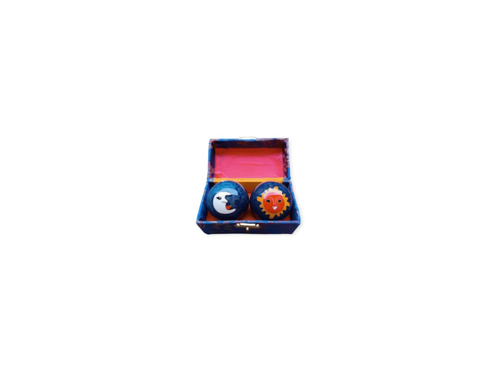 Modré čínské meditační koule o průměru 4,5 cm jsou zdobené klasickým motivem slunce a měsíce – symbolem rovnováhy mezi světlem a tmou, aktivitou a odpočinkem. Při jemném otáčení v dlaních vydávají uklidňující zvuk, který pomáhá uvolnit napětí, soustředit mysl a zklidnit tělo. Koule se používají při meditaci, relaxaci nebo jako pomůcka pro zlepšení koordinace a jemné motoriky. Jsou uloženy v elegantní ozdobné krabičce a představují i krásný dárkový předmět.