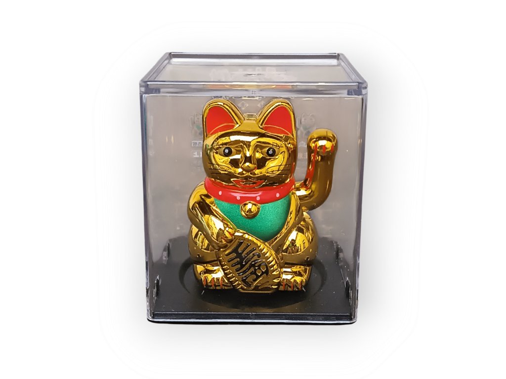 Zlatá mávající kočka Maneki Neko o výšce 5 cm je tradiční japonský symbol štěstí, bohatství a úspěchu. V Asii bývá často umístěna v obchodech, kancelářích nebo domácnostech, kde svým máváním přitahuje pozitivní energii a prosperitu.