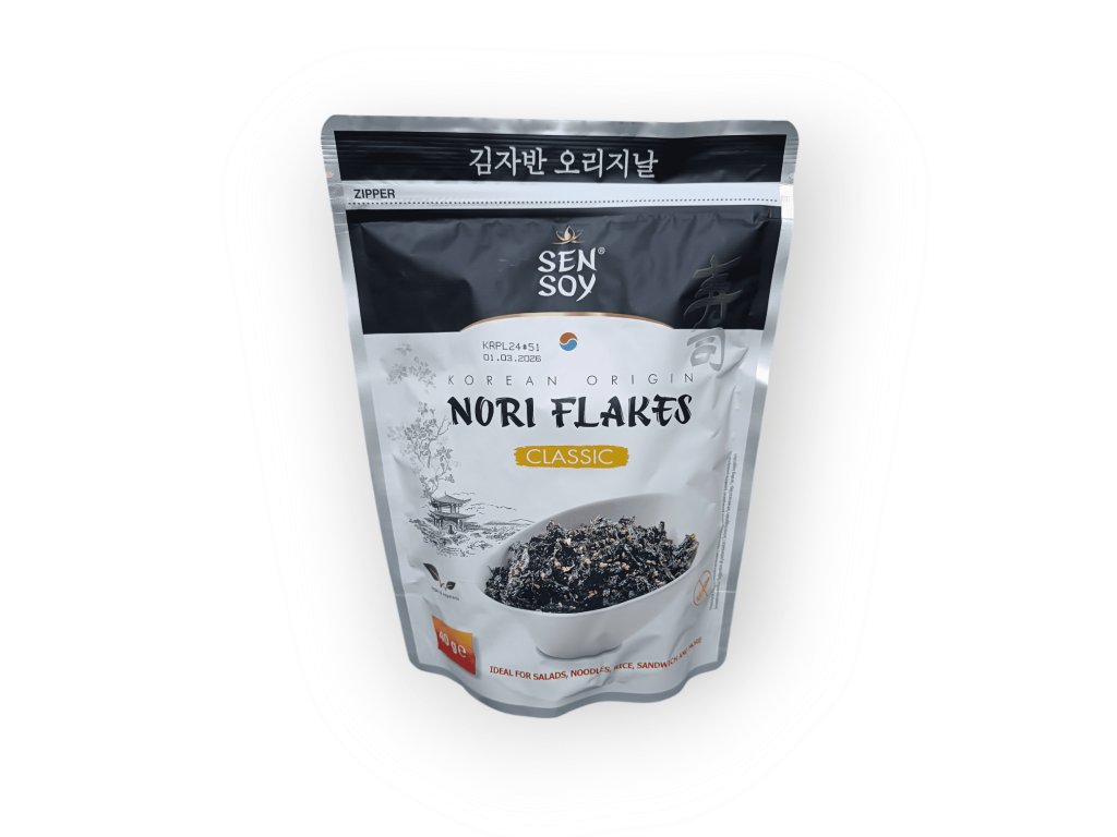 Vločky z mořských řas Sen Soy Nori Flakes Classic přinášejí autentickou chuť moře do každého jídla. Jsou pražené na směsi kukuřičného a sezamového oleje, díky čemuž mají jemně oříškovou chuť a příjemně křupavou strukturu. Skvěle se hodí jako posyp na rýži, nudle, sushi či saláty. Produkt je přirozeně bohatý na jód – doporučená denní dávka je 10 g.